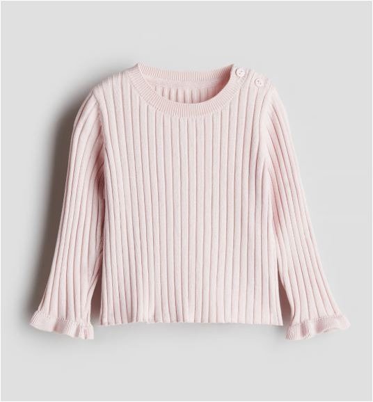 Suéter suave de punto acanalado. Cuello acanalado, botones en un hombro y puños con volante.
